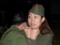 In roaring thundering and lightning, a three-soldier military team marches. Suddenly, gunshots ring out and an officer is hit. Everyone hits the dirt. A female soldier asks, "Do you have a wife, officer?" "Yes, I'm married," he says. They crawl with difficulty toward each other and hug.