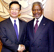 Wen arrived in a 20-car motorcade, about half of it made up of US security agents. He spoke to Annan about Iraq, Korea, UN reform, AIDS and development in Africa, where Wen will visit after his trip to the United States, Canada and Mexico.