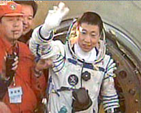 China's first astronaut Yang Liwei walked out of the re-entry capsule of Shenzhou V spacecraft at 6:45 this morning. He remains in good health after a 21-hour space odyssey.