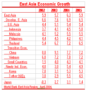 Fueled by growing exports, low interest rates, and high investment in China, Vietnam, and Thailand, East Asia's economy is expected to grow by more than 6 percent in 2004, the strongest since the beginning of the global slowdown in early 2000, according to the latest East Asia and Pacific Regional Update, the World Bank's twice-yearly look at the region's economies.