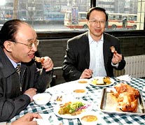 "It is safe to have chicken because all the chicken here is from areas without bird flu," Du Qinglin, Minister of Agriculture, said to reporters and his colleagues while ordering dishes like chicken braised in brown sauce.