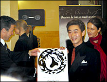 As the Danish Prime Minister announced the appointment of basketball star Yao Ming, the audience was surprised to see a huge poster of the 227-centimeter (7’5") Houston Rockets center brought forward. Yao Ming is in the United States preparing for a game and was unable to attend the opening ceremonies.