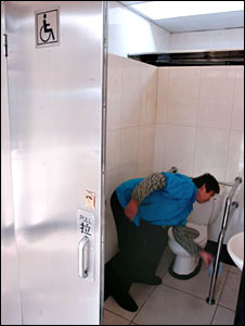 "It is undoubtedly good indeed for the disabled. This is a step forward, providing facilities that help the handicapped lead a better life, without barriers," says an official from the China Disabled Persons' Federation (CDPF). However, he notes, there are aspects of the daily administration of the restrooms that need to be perfected. He reports that there are now 60 million handicapped people in China, 8.77 million of whom have difficulty walking or cannot walk at all. Beijing alone is home to 400,000 handicapped people. There are clearly many people who have need of the specially designed restrooms.