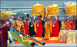 Nearly a thousand believers, including primary and middle school students from Buddhist schools, gathered in front of the HKCE and waved banners to welcome the relic while 3,000 devout followers waited inside. Kok Kwong presided over the ceremony as monks offered flowers and chanted scriptures. Kok Kwong wished for a peaceful world, stable society and auspiciousness in all fields.