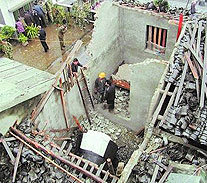A photo in the Tianfu Morning News showed the kettle-shaped capsule, apparently about two meters long, lying amid broken bricks, beams and roof tiles. Another photo showed the capsule being lifted from the building as spectators crowded onto surrounding rooftops.