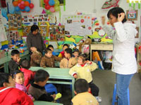 Now Miao can take Jingsheng to the free kindergarten at 9:00 AM every day, where the boy learns through games and stories and takes part in various outdoor activities under the guidance of voluntary student teachers from Beijing Normal University.
