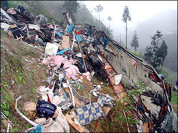 Police said the bus was torn apart in the fall and 25 people were killed instantly, including the driver. Two others died later, one on his way to a nearby hospital and the other in the emergency room.