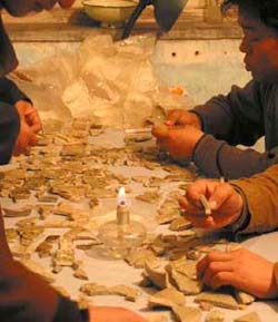 Now their main work involves reassembling bone and tortoiseshell fragments, hundreds of which have been unearthed but, unlike those from the Yinxu Ruins, almost none of which are complete. Once they are pieced together, the inscriptions may divulge more detailed information.