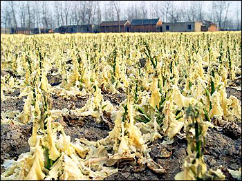 In nearby fields, the rape plants have already wilted. Local farmers, who depend on the crop for edible oil and income, say that it may be as much as two years before the soil is usable again.