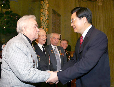 President Hu Jintao met Russian war veterans who helped fight Japanese invaders during World War II and their representatives, hours after his arrival in Moscow on Sunday.