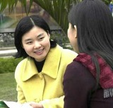 Two civil servants exchange their English learning experiences in a park in Shapingba District of Chongqing, a municipality in southwest China, on December 17, 2001.