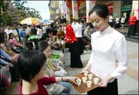 As Beijing is going to get rid of SARS, Beijingers begin to enjoy their outdoor life again. The weekend tea show on Wangfujing Dajie attracts many people on June 13.