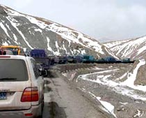 Several truck drivers told Xinhua at 22:30 Monday at the checkpoint in Golmud, the terminal of the Qinghai-Tibet highway, that they had just come down from the mountain pass and traffic there was restored with the help from two railway policemen but several hundred vehicles were still waiting to pass.