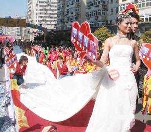 A model displayed a wedding costume with a 50-meter train held by 12 children on a 100-meter T-stage at Nanjing's Hunan Road March 3. The train is the longest in the world and the dressmaker has applied for Guinness World Record status in Shanghai.