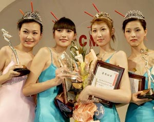 Zhao Chenchi (second from right), Bai Yunping (right) are ranked first and second, respectively, in the fifth Chinese Model Contest held in Shishi City, east China's Fujian Province April 17, 2005. More than 10,000 candidates took part in the contest, with 60 entering Sunday's final. Wang Qing (left) and Shan Jingya shared the third prize.