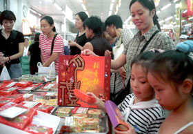Customers purchase moon cakes at Daoxiangcun Foodstuff Shop in Beijing August 20, prior to the Mid-autumn Festival(15th day of the 8th lunar month) , which falls on September 21 this year. The shop adopts new measures to ensure the quality of its brand products for its marketing share.