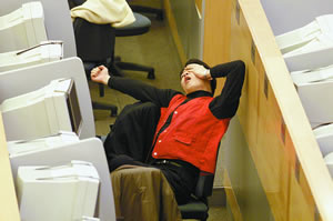 "I can't get enough sleep on work days," complained a man of 29. Having to get to work at 8:30am forces him to get up at 7:00am. To make up for the lost sleep, he sleeps to the full on weekends, getting up after noon.