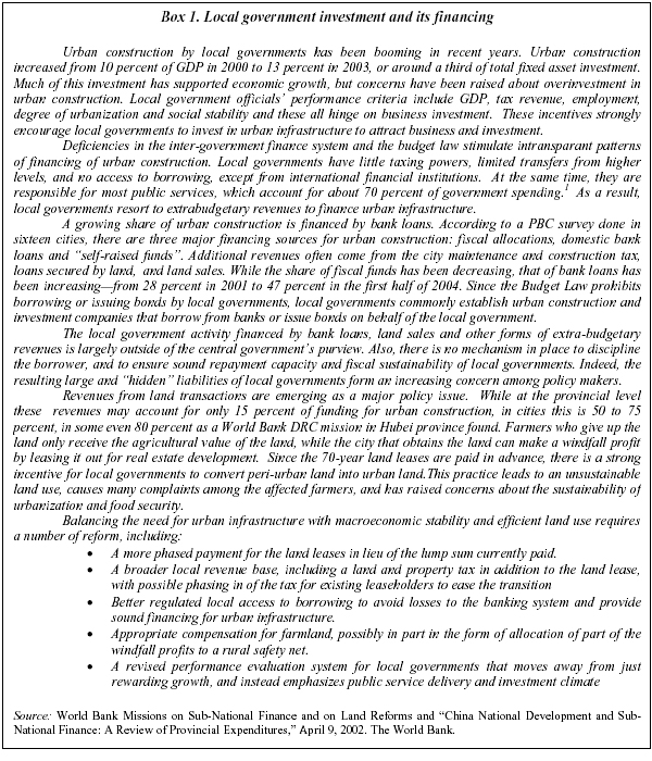 Indeed, there seems to be significant scope for such a shift: the flow-of-funds tables in the national accounts show, surprisingly, that general government (central and local) is a voracious saver. China's government saved some 7.5 percent of GDP in 2003, whereas governments in countries such as Japan and the USA dissaved some 2.2 and 1 percent of GDP respectively. China's budgetary investments are with 3.8 percent of GDP rather modest. However, capital transfers to enterprises, such as construction companies that build infrastructure but also commercial enterprises, is over 6 percent of GDP. So in total, the government budget alone finances some 10 percent of GDP in investment— almost a quarter of all investment in China. 5 Urban construction and real estate development have been one of the key contributors to China's high investment rates. Changes in the urban financing system in particular are needed to moderating local governments' incentives to invest (Box 1).