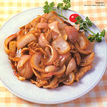 3. Keep 50g (3 1/2 tbsp) of oil in the wok. Throw in the onion slices to stir-fry. Add the water, salt, MSG, soy sauce and sugar and bring to boiling point. Use the mixture of cornstarch and water to thicken the soup, add the meat slices and stir. Take out to serve.