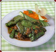 3. Keep 25 g (1 2/3 tbsp) of oil in the wok to fry the scallions and ginger until they give off a strong aroma. Add the green beans, stir several times, put in the spicy bean paste, vinegar, red chili, sugar, soy sauce and water and simmer for 10 minutes. When the soup turns red, turn the fire up strong so as to boil off some of the liquid. Add the mixture of cornstarch and water to thicken the soup, sprinkle the sesame oil and put in a serving plate.