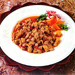 3. Heat the oil in the wok to 70-100oC (160-210oF) and stir-dry the diced pork until it is done. Take out and drain off the oil. Leave 20 g (1 1/2 tbsp) oil in the wok and stir-fry the scallions, ginger, garlic and red chili until they produce a strong aroma. Put in the pre-prepared sauce and diced pork. Stir evenly and take out to serve.
