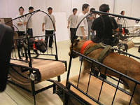With their installation work of 10 hounds running and growling on 10 walking machines, one facing another, artists Sun Yuan and Peng Yu attracted most of the attention at the opening of the exhibition. The work - entitled Controversy Model - mocks the debate among media outlets controlled by different interest groups.