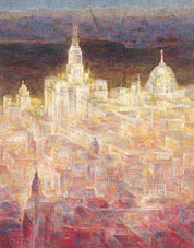 His architecture series is a real reflection of the city's history and reality. Shanghai, a City with Gay Night Life presents the audience Shanghai's symbolic architecture group: Shanghai Bund architecture group in gorgeous golden color. This painting is not only a recall of old Shanghai, but also a forecast for Shanghai's splendid future. In Shanghai Viaduct Bridge, under-construction viaduct bridges are put into abstract forms. With Western focusing perspective theory and various colors of minerals and metals used, this painting is dignified and imposing. These works mentioned above have generally won applause both in China and beyond.