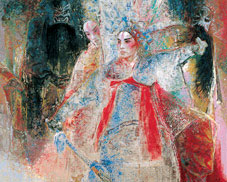 often employed through theatrical costumes and adornments in gaudy colors. He also uses dazzling gold color and dense ink to create a resplendent and magnificent visual effect. Modern western modeling method is also used on purpose to meddle the visual space and smash the images, making the works more powerful and lively.
