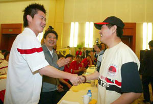 Zhao Benshan (R) shakes hands with Zhao Junzhe, captain of the Liaoning Team