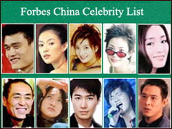 Forbes, which began to publish in China last year, confined its list to stars born on the mainland "in view of the fact that the mainland's show business still lags behind Taiwan and Hong Kong," it said. But Chinese stars are doing better than before on the home front. Actress Zhang Ziyi, the face of Coca-Cola and Maybelline in China, came in second. Mainland television nymphet Zhao Wei was third.
