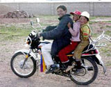 The picture shows that a Tibetan motorcyclist with kids stops for photographer in his way to the local town in Shuanghu of far north Tibet Autonomous Region.