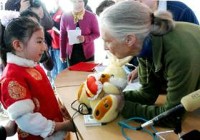 The picture shows that Dr. Jane Goodall, an English scientist who is called "an Einstein in the field of Zoological Behaviorists", presents a gift to a girl in an activity held at the Education Center of Zoological Environmental Protection in Beijing Wednesday, November 21, 2001.