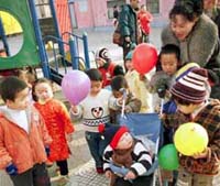 Children from the Xining Welfare House of Qinghai Province arrive at the Xinle Kindergarten in the city on December 30. They were invited to celebrate New Year with kids at the kindergarten.