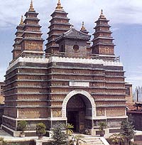 The pagoda is a typical example of vajrasana style. The tall, large pedestal, fourteen meters high, sits on a rather low platform. An arched gate in the middle of the pedestal has a horizontal board inscribed with the pagoda's name in three languages, Han, Mongolian and Tibetan. All four sides of the pedestal have beautifully executed sculptures of heavenly kings, guardians and Sanskrit inscriptions. Since the upper part of the pedestal is covered with glazed bricks, the pagoda looks brighter and more colorful than pagodas of the same style in Beijing. Stone steps inside the pedestal on both sides of the gate lead to a small pavilion on top. The middle pagoda is larger than the other four, but all are covered with ornamental carvings. The steeple on the four smaller pagodas are similar to that on the Zhenjue Temple pagoda in Beijing -- a miniature Lamaist dagoba.