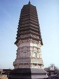 Located in the county town of Changli near Qinhuangdao City, the pagoda is a thirteen-storey octagonal structure of thirty meters high. Though the pagoda is typical of the multi-eaved style of the Liao and Kin dynasties, the sculptures and ornaments on the first storey are different from those on other pagodas of the same period. Instead of the usual Buddhist images of Buddha, bodhisattvas, heavenly kings, guardians, flying apsarases and so on, they are multistorey buildings, city gates, balconies and passages, resembling a heavenly palace. It is a rear example among ancient buildings in China.