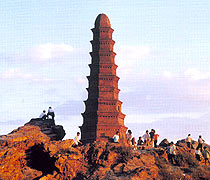The octagonal, nine-storey, brick pagoda is not very big and cannot be climbed. It has no doors or windows. It was intended as a geornantic omen. The pagoda's lower part is massive and the first three storeys are bulky, then the pagoda tapers off sharply, making it very steady. A huge octagonal top looks as if it were there to keep the whole pagoda in place. The brick eaves are very narrow, indicating the designer took into consideration the strong winds on top of the hill.