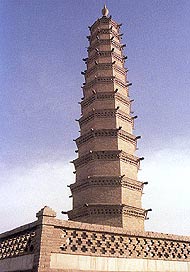 The pagoda, located on North Street of the county town of Wuwei, is said to have been built for keeping the bones of Kumarajiva, an eminent monk in the Later Qin Dynasty. A temple, also called Kumarajiva, was destroyed in an earthquake in 1927. Half the pagoda was also destroyed during the earthquake, but the pagoda was rebuilt in 1934. The hollow, octagonal, twelve-storey, brick pagoda is thirty-two meters high. The first, third, fifth and eighth storeys have a door on the east side, and the twelfth storey has a small niche housing a Buddhist statue. The pent roofs do not correspond to the floors inside and they are very narrow. Their four corners bend upward, and bells hang from them. The steeple is an inverted bowl topped by a canopy and a copper vase. The whole pagoda looks imposing and elegant and is a famous historical site in Wuwei.