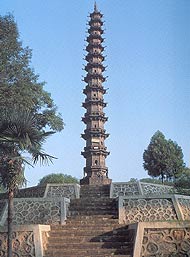 The octagonal, thirteen-storey pagoda, modelled after wooden multistoreyed pagodas, is 17.9 meters high. It looks elegant and graceful and is one of the best-preserved iron pagodas in China.