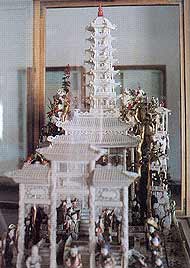 The ivory pagoda is part of a large ivory carving called Birthday Congratulations from the Celestial. The miniature pagoda, hills, pavilions and other buildings, all carved from ivory, form a picturesque model garden. The pagoda has thirteen storeys, entirely in the style of wooden structures. The columns, doors, windows, eaves and balustrades are all depicted in detail. Little bells hang from the corners of the upturned eaves. Figurines are on every storey of the pagoda, some walking along the verandas, some sitting inside, looking at the view outside, some leaning on the balustrades as if deep in thought, and some coming out of the pagoda. The pagoda, about a meter in height and all white except for its scarlet steeple, looks dazzlingly brilliant among the miniature hills, pavilions, trees, flowers and people.