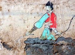The murals on the eastern side all feature men traveling in horse carriages. Some are on hunting trips, chasing game, or pulling full a bow, about to shoot a dear, or holding a long spear in pursuit of a wild bull, or getting off a horse to pick up the loot. Wild pheasants soar into the air, while the wounded bull are seen struggling on the ground.