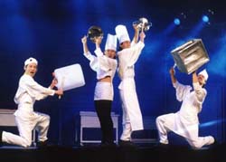 The four versatile performers turn all kinds of kitchen items pots, pans, dishes, knives, chopping boards, water bottles and even brooms into percussion instruments. And cucumbers, cabbages and onions fly in the air.
