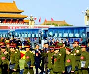 Delegates of the Beijing group discuss the report delivered by Jiang Zemin at the 16th National Congress of the Communist Party of China (CPC).