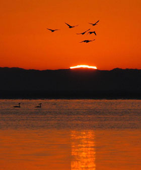A flock of white swans are frolicking at the Dalinor Lake, Inner Mongolia on Oct 6th. Tens of thousands of white swans have flown from Siberia to the Lake recently. Dalinor is a National Natural Reserve comprising grassland, lakes, wetland, sand and woods. It is home to 160 kinds of rare birds.
