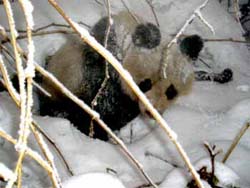 Rescue workers put a net around a giant panda found stranded in the snow at Xiling Snow Mountain, Dayi County, southwest China's Sichuan Province January 6, 2003.