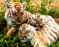 Two-month-old South China Tiger triplets, bred naturally, play on the grass at the South China Tiger Breeding Farm in Suzhou, Jiangsu Province, Feb. 20, 2004.