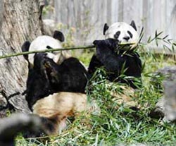 Chinese giant pandas Tian Tian and Mei Xiang eat bamboo at Washington National Zoo on April 6, 2004. Anthony A. Williams, mayor of Washington, declared on Tuesday that April has been designated as the month of panda.