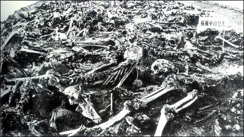 The Japanese troops massacred countless people during their "mopping-up" operations. Shown are the bones of Chinese as the result of the "Pindingshan Massacre" in northeast China.