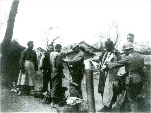 In the enemy-occupied areas the Chinese people suffered great humiliation. Shown are Japanese troops examining innocent villagers.