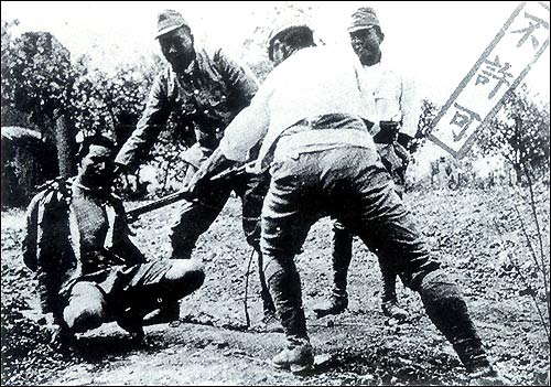 Japanese soldiers used Chinese people as live targets. Shown is one example of their atrocities. According to the stamp on this photo taken by one of the butchers, it was forbidden to show this picture by Japanese authority.