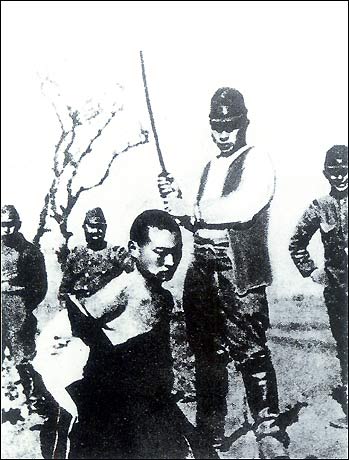 A Japanese soldier about to bring his saber down on a Nanjing youth.